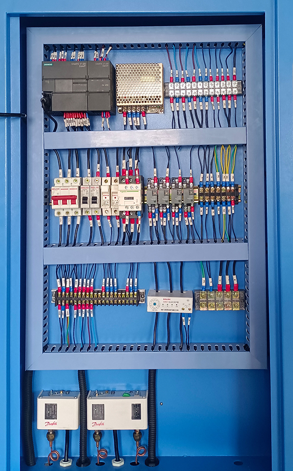 控制面板:觸摸屏顯示,有壓縮機運行指示、報警指示、遠近程轉換開關、遠程運行指示