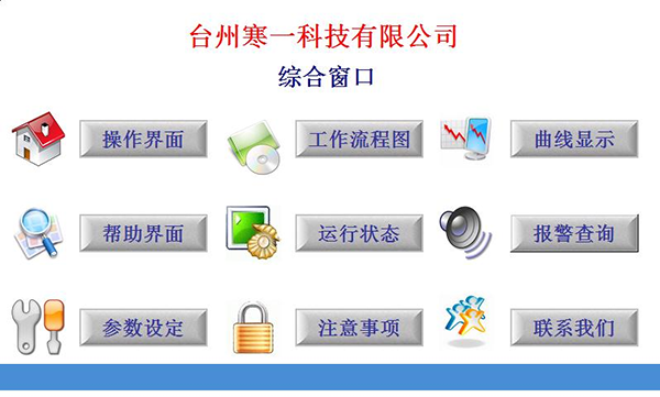 溫度顯示:制冷溫度、待機溫度、冷卻水水溫等多路溫度顯示,運行狀態欄有待機運行、制冷運行、除霜運行等狀態顯示,故障報警欄有水溫高報警、水溫高停機、電源缺相、壓縮機過載、排氣溫度過高等保護措施