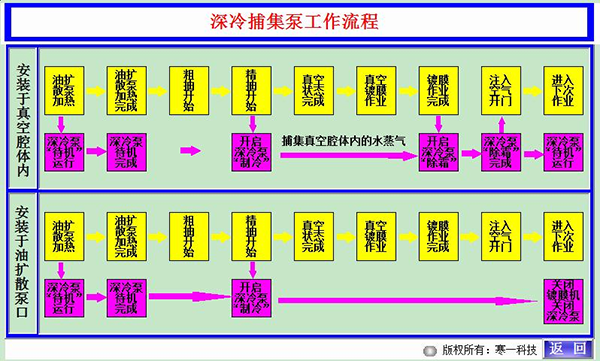 工作流程圖:改圖詳細介紹了深冷捕集泵跟真空鍍膜機配合使用時,深冷泵開關機時間,開啟制冷的時間和開啟除霜的時間,以便發揮捕集泵最佳性能。