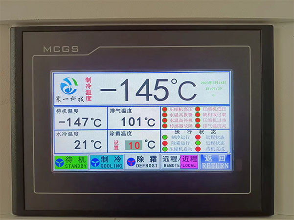 Temperature display: refrigeration temperature, standby temperature, cooling water temperature and other multi-channel temperature display, the running status bar has standby operation, refrigeration operation, defrost operation and other status display, fault alarm bar has high water temperature alarm, high water temperature shutdown, power supply phase shortage, compressor overload, exhaust temperature over high protection measures